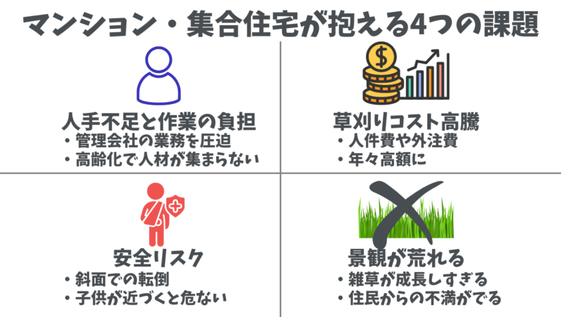 マンションの芝生管理は、外注費の高騰や人手不足、住民への配慮など、解決が難しい課題が多くありました。