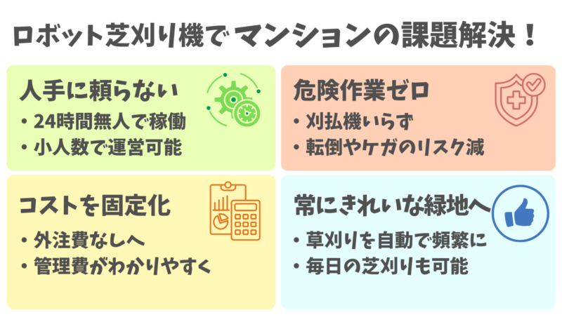 この記事では、マンション・集合住宅にロボット芝刈り機を導入するべきか判断しやすいように、次のポイントをわかりやすくまとめています。